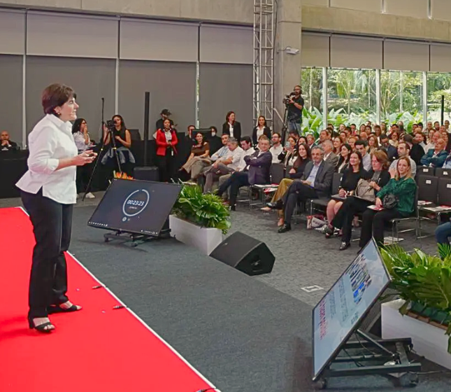 Lina Vélez de Nicholls, presidenta ejecutiva de la Cámara de Comercio de Medellín para Antioquia, durante la presentación del informe de gestión de la corporación en el Encuentro de Afiliados 2025.